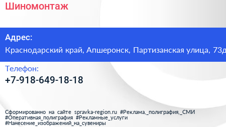 Шиномонтаж по адресу Краснодарский край, Апшеронск, Партизанская улица, 73д в дальнейшем Организация, размещена в следующих категориях: