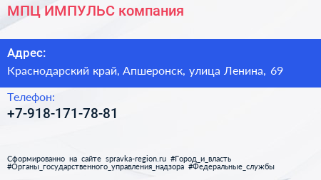 МПЦ-ИМПУЛЬС, компания по адресу Краснодарский край, Апшеронск, улица Ленина, 69 в дальнейшем Организация, размещена в следующих категориях: