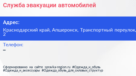 Служба эвакуации автомобилей по адресу Краснодарский край, Апшеронск, Транспортный переулок, 2 в дальнейшем Организация, размещена в следующих категориях:
