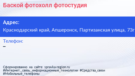 Баской фотохолл, фотостудия по адресу Краснодарский край, Апшеронск, Партизанская улица, 73г в дальнейшем Организация, размещена в следующих категориях: