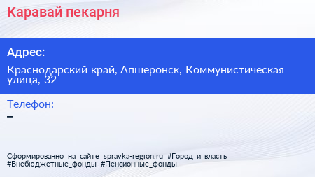 Каравай, пекарня по адресу Краснодарский край, Апшеронск, Коммунистическая улица, 32 в дальнейшем Организация, размещена в следующих категориях: