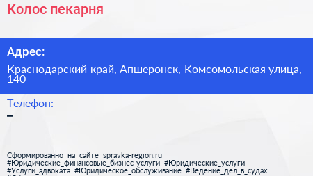 Колос, пекарня по адресу Краснодарский край, Апшеронск, Комсомольская улица, 140 в дальнейшем Организация, размещена в следующих категориях: