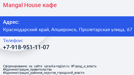 Mangal House, кафе по адресу Краснодарский край, Апшеронск, Пролетарская улица, 67 в дальнейшем Организация, размещена в следующих категориях: