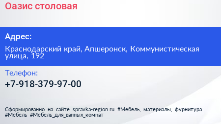Оазис, столовая по адресу Краснодарский край, Апшеронск, Коммунистическая улица, 192 в дальнейшем Организация, размещена в следующих категориях: