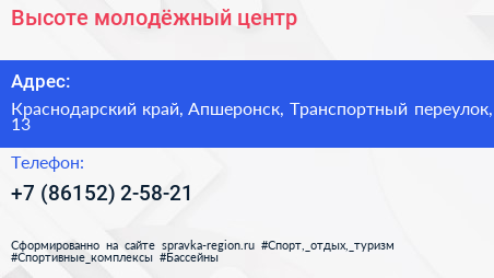 Высоте!, молодёжный центр по адресу Краснодарский край, Апшеронск, Транспортный переулок, 13 в дальнейшем Организация, размещена в следующих категориях: