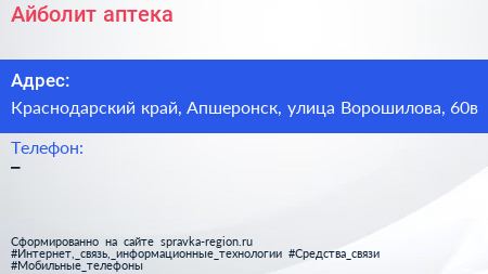 Айболит, аптека по адресу Краснодарский край, Апшеронск, улица Ворошилова, 60в в дальнейшем Организация, размещена в следующих категориях: