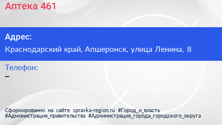 Аптека №461 по адресу Краснодарский край, Апшеронск, улица Ленина, 8 в дальнейшем Организация, размещена в следующих категориях: