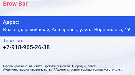 Brow Bar по адресу Краснодарский край, Апшеронск, улица Ворошилова, 19 в дальнейшем Организация, размещена в следующих категориях: