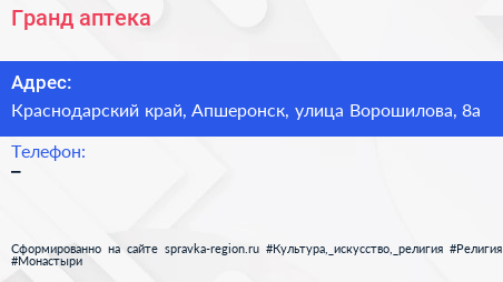 Гранд, аптека по адресу Краснодарский край, Апшеронск, улица Ворошилова, 8а в дальнейшем Организация, размещена в следующих категориях: