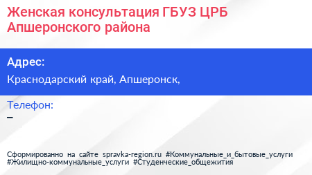 Женская консультация, ГБУЗ ЦРБ Апшеронского района по адресу Краснодарский край, Апшеронск, в дальнейшем Организация, размещена в следующих категориях: