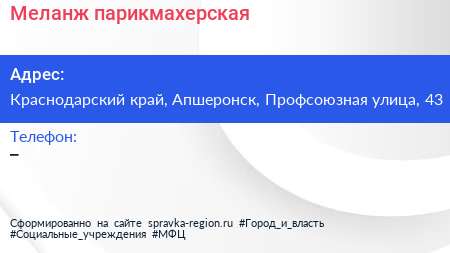 Меланж, парикмахерская по адресу Краснодарский край, Апшеронск, Профсоюзная улица, 43 в дальнейшем Организация, размещена в следующих категориях: