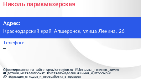 Николь, парикмахерская по адресу Краснодарский край, Апшеронск, улица Ленина, 26 в дальнейшем Организация, размещена в следующих категориях: