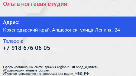 Ольга, ногтевая студия по адресу Краснодарский край, Апшеронск, улица Ленина, 24 в дальнейшем Организация, размещена в следующих категориях: