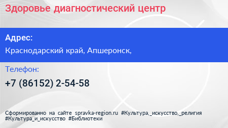 Здоровье, диагностический центр по адресу Краснодарский край, Апшеронск, в дальнейшем Организация, размещена в следующих категориях: