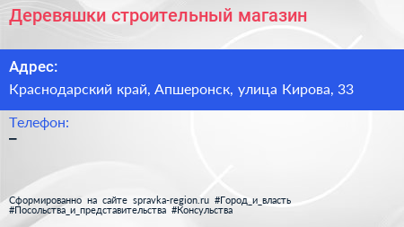 Деревяшки, строительный магазин по адресу Краснодарский край, Апшеронск, улица Кирова, 33 в дальнейшем Организация, размещена в следующих категориях: