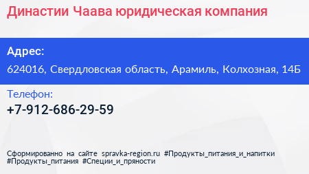 Династии Чаава, юридическая компания по адресу 624016, Свердловская область, Арамиль, Колхозная, 14Б в дальнейшем Организация, размещена в следующих категориях: