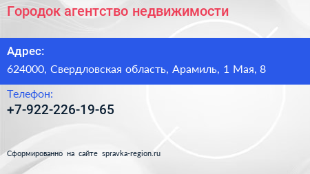 Городок, агентство недвижимости по адресу 624000, Свердловская область, Арамиль, 1 Мая, 8 в дальнейшем Организация, размещена в следующих категориях: