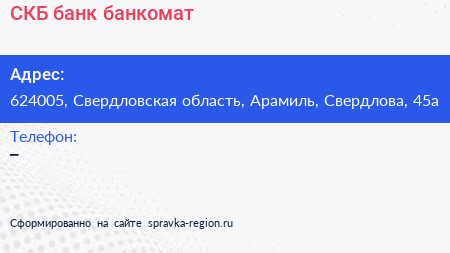 СКБ-банк, банкомат по адресу 624005, Свердловская область, Арамиль, Свердлова, 45а в дальнейшем Организация, размещена в следующих категориях: