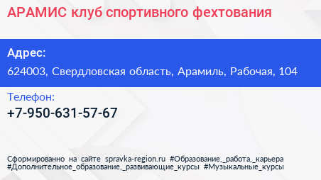 АРАМИС, клуб спортивного фехтования по адресу 624003, Свердловская область, Арамиль, Рабочая, 104 в дальнейшем Организация, размещена в следующих категориях: