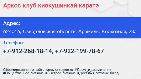 Аркос, клуб киокушинкай каратэ по адресу 624016, Свердловская область, Арамиль, Колхозная, 23а в дальнейшем Организация, размещена в следующих категориях: