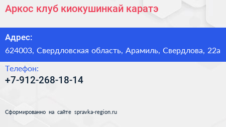 Аркос, клуб киокушинкай каратэ по адресу 624003, Свердловская область, Арамиль, Свердлова, 22а в дальнейшем Организация, размещена в следующих категориях: