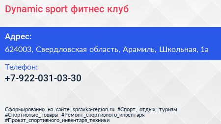 Dynamic sport, фитнес-клуб по адресу 624003, Свердловская область, Арамиль, Школьная, 1а в дальнейшем Организация, размещена в следующих категориях: