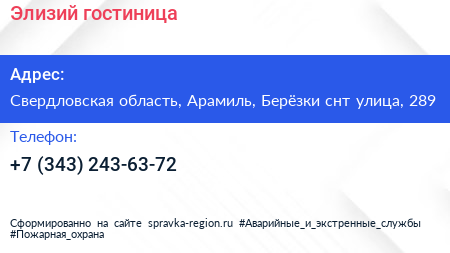 Элизий, гостиница по адресу Свердловская область, Арамиль, Берёзки снт улица, 289 в дальнейшем Организация, размещена в следующих категориях: