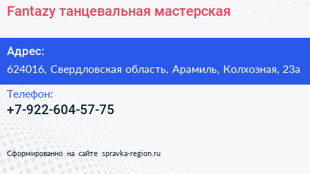 Fantazy, танцевальная мастерская по адресу 624016, Свердловская область, Арамиль, Колхозная, 23а в дальнейшем Организация, размещена в следующих категориях: