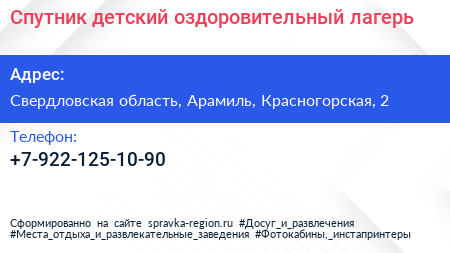 Спутник, детский оздоровительный лагерь по адресу Свердловская область, Арамиль, Красногорская, 2 в дальнейшем Организация, размещена в следующих категориях: