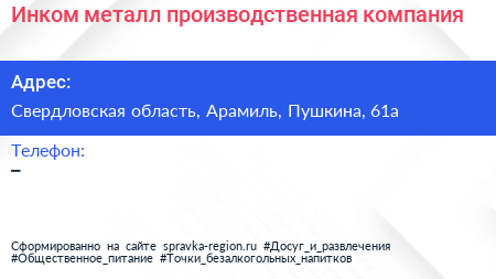 Инком-металл, производственная компания по адресу Свердловская область, Арамиль, Пушкина, 61а в дальнейшем Организация, размещена в следующих категориях: