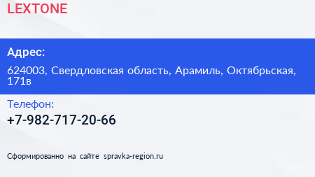 LEXTONE по адресу 624003, Свердловская область, Арамиль, Октябрьская, 171в в дальнейшем Организация, размещена в следующих категориях: