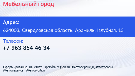 Мебельный город по адресу 624003, Свердловская область, Арамиль, Клубная, 13 в дальнейшем Организация, размещена в следующих категориях: