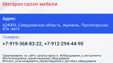 Мегарон, салон мебели по адресу 624003, Свердловская область, Арамиль, Пролетарская, 87в лит3 в дальнейшем Организация, размещена в следующих категориях: