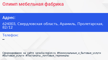 Олимп, мебельная фабрика по адресу 624003, Свердловская область, Арамиль, Пролетарская, 82/12 в дальнейшем Организация, размещена в следующих категориях: