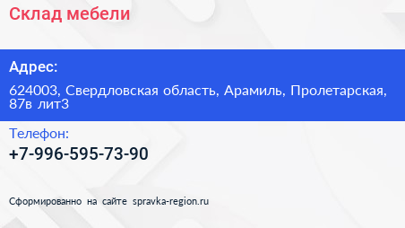 Склад мебели по адресу 624003, Свердловская область, Арамиль, Пролетарская, 87в лит3 в дальнейшем Организация, размещена в следующих категориях:
