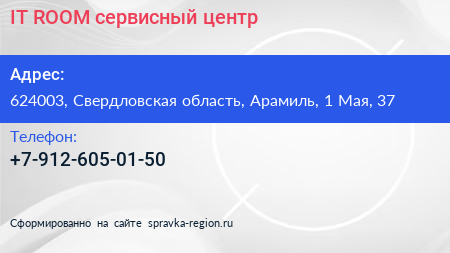 IT-ROOM, сервисный центр по адресу 624003, Свердловская область, Арамиль, 1 Мая, 37 в дальнейшем Организация, размещена в следующих категориях: