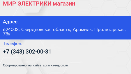 МИР ЭЛЕКТРИКИ, магазин по адресу 624003, Свердловская область, Арамиль, Пролетарская, 78а в дальнейшем Организация, размещена в следующих категориях:
