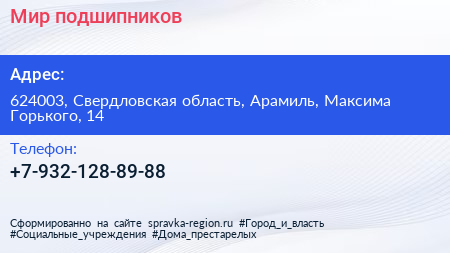 Мир подшипников по адресу 624003, Свердловская область, Арамиль, Максима Горького, 14 в дальнейшем Организация, размещена в следующих категориях: