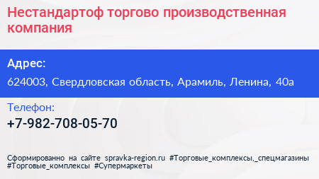 Нестандартоф, торгово-производственная компания по адресу 624003, Свердловская область, Арамиль, Ленина, 40а в дальнейшем Организация, размещена в следующих категориях:
