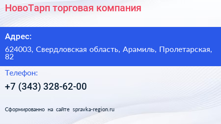 НовоТарп, торговая компания по адресу 624003, Свердловская область, Арамиль, Пролетарская, 82 в дальнейшем Организация, размещена в следующих категориях: