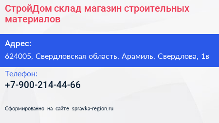 СтройДом, склад-магазин строительных материалов по адресу 624005, Свердловская область, Арамиль, Свердлова, 1в в дальнейшем Организация, размещена в следующих категориях: