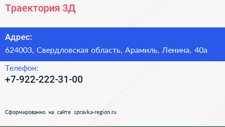 Траектория 3Д по адресу 624003, Свердловская область, Арамиль, Ленина, 40а в дальнейшем Организация, размещена в следующих категориях: