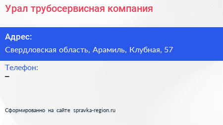 Урал, трубосервисная компания по адресу Свердловская область, Арамиль, Клубная, 57 в дальнейшем Организация, размещена в следующих категориях: