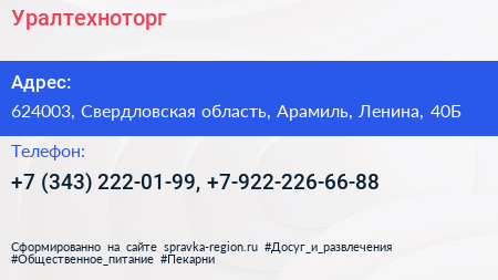 Уралтехноторг по адресу 624003, Свердловская область, Арамиль, Ленина, 40Б в дальнейшем Организация, размещена в следующих категориях: