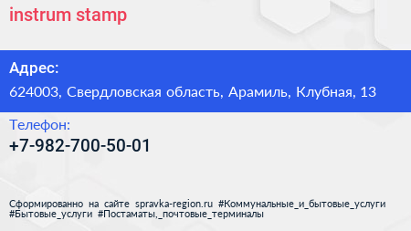 instrum-stamp по адресу 624003, Свердловская область, Арамиль, Клубная, 13 в дальнейшем Организация, размещена в следующих категориях: