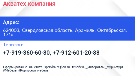Акватех, компания по адресу 624003, Свердловская область, Арамиль, Октябрьская, 171а в дальнейшем Организация, размещена в следующих категориях: