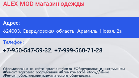 ALEX MOD, магазин одежды по адресу 624003, Свердловская область, Арамиль, Новая, 2а в дальнейшем Организация, размещена в следующих категориях: