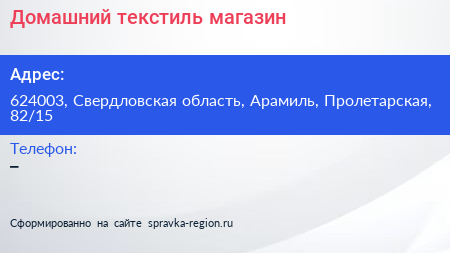 Домашний текстиль, магазин по адресу 624003, Свердловская область, Арамиль, Пролетарская, 82/15 в дальнейшем Организация, размещена в следующих категориях: