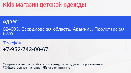 Kids, магазин детской одежды по адресу 624003, Свердловская область, Арамиль, Пролетарская, 82/6 в дальнейшем Организация, размещена в следующих категориях: