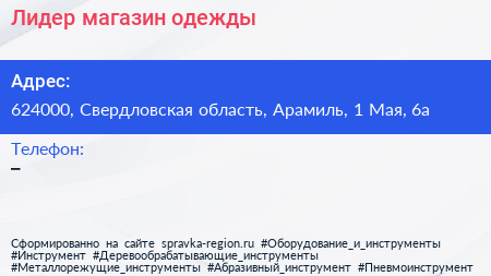 Лидер, магазин одежды по адресу 624000, Свердловская область, Арамиль, 1 Мая, 6а в дальнейшем Организация, размещена в следующих категориях:
